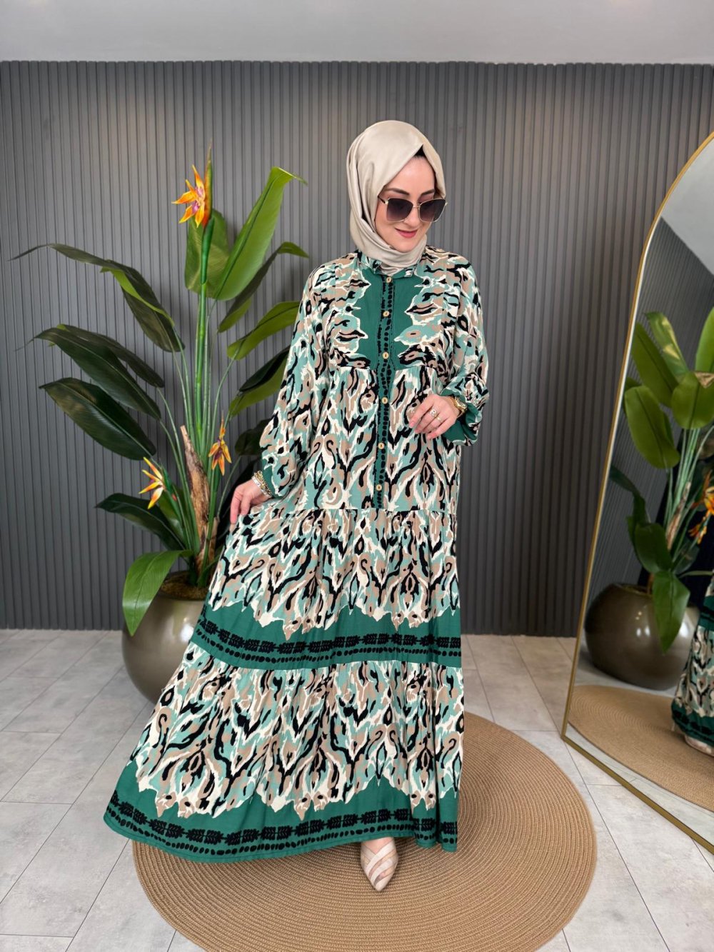 Batik Desen Belden Düğmeli Viskon Elbise ?✨