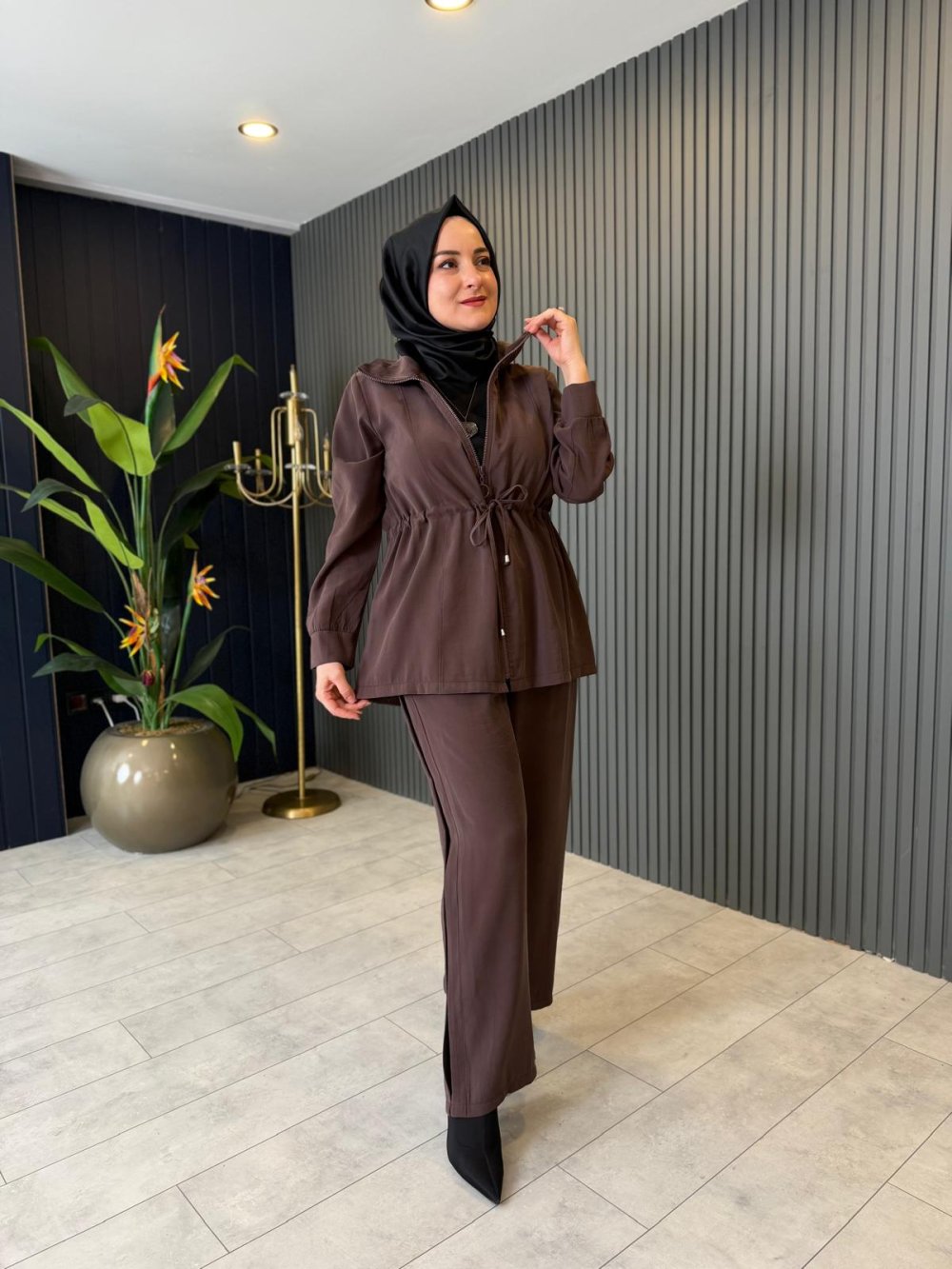 Bel Büzgü Detaylı Tensel Pantolon Takım Kahve