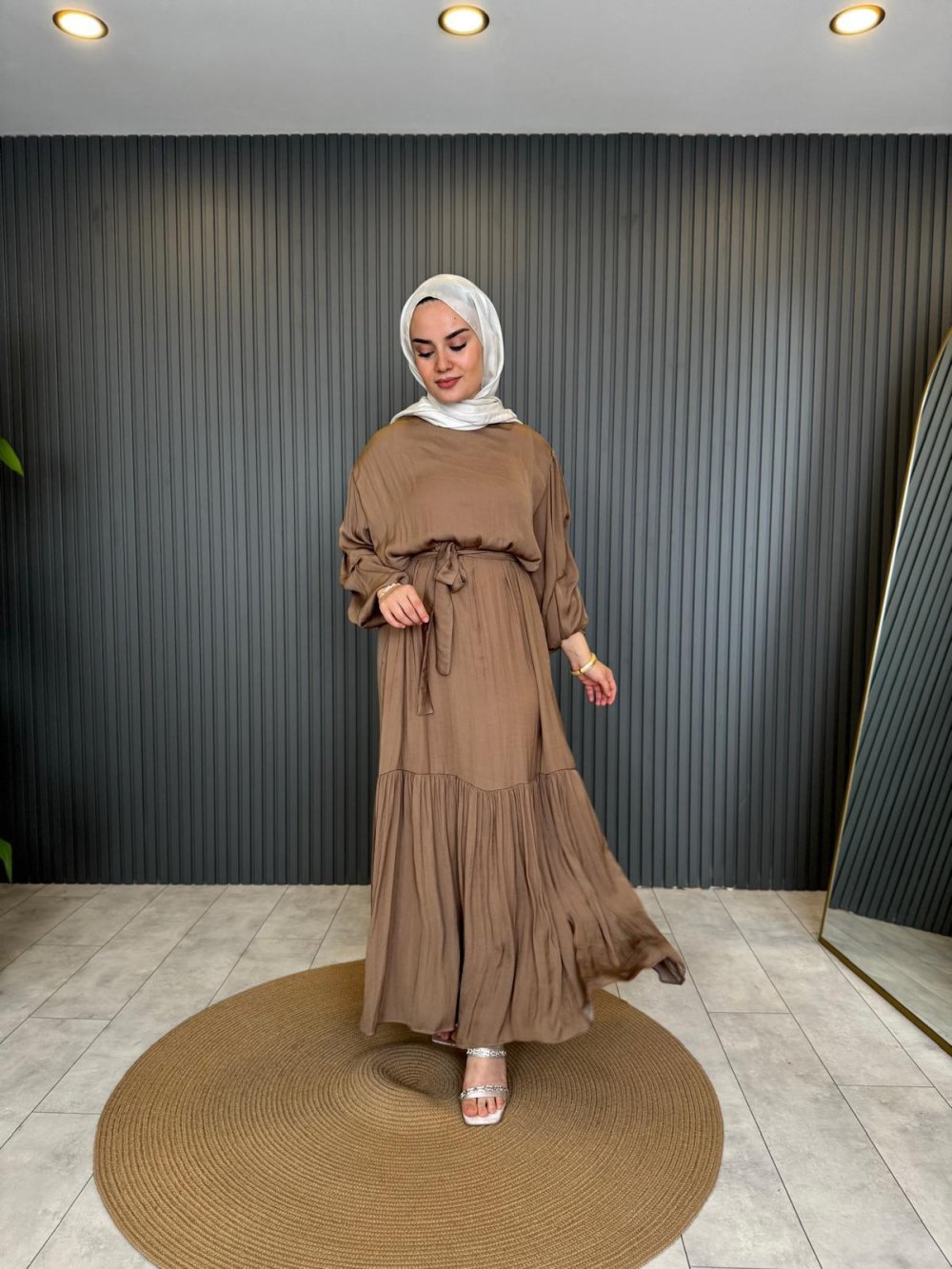 Belden Kuşaklı Büzgü Detaylı Elbise Kakao
