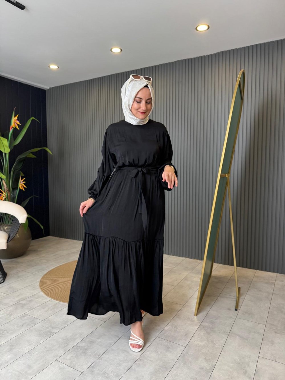 Belden Kuşaklı Büzgü Detaylı Elbise Siyah