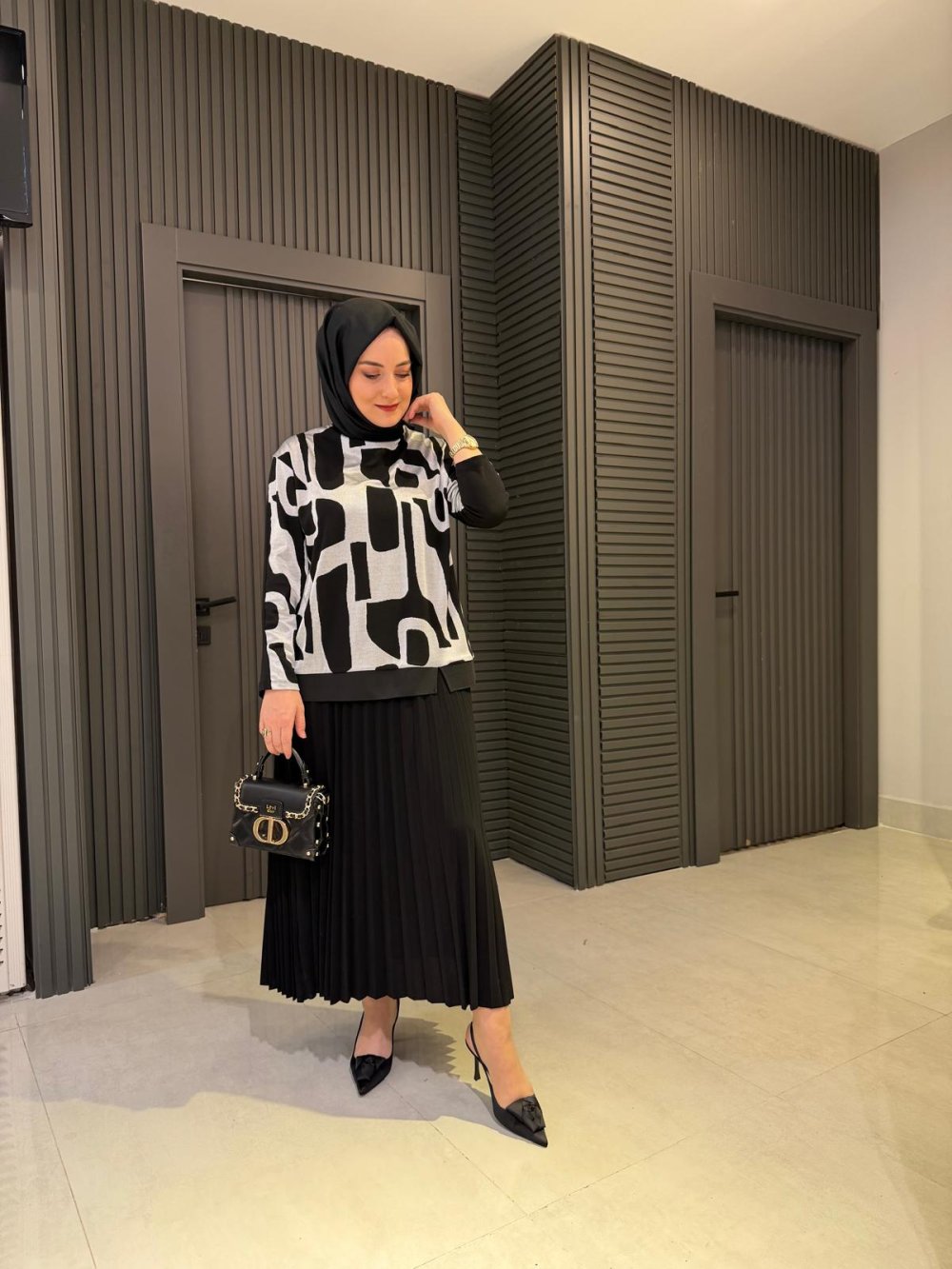 Blok Desenli Ecrin Etekli Takım Siyah-Gri