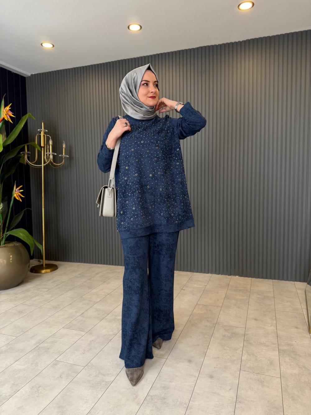 Boncuk İşleme Detaylı Pantolon Takım İndigo Mavi