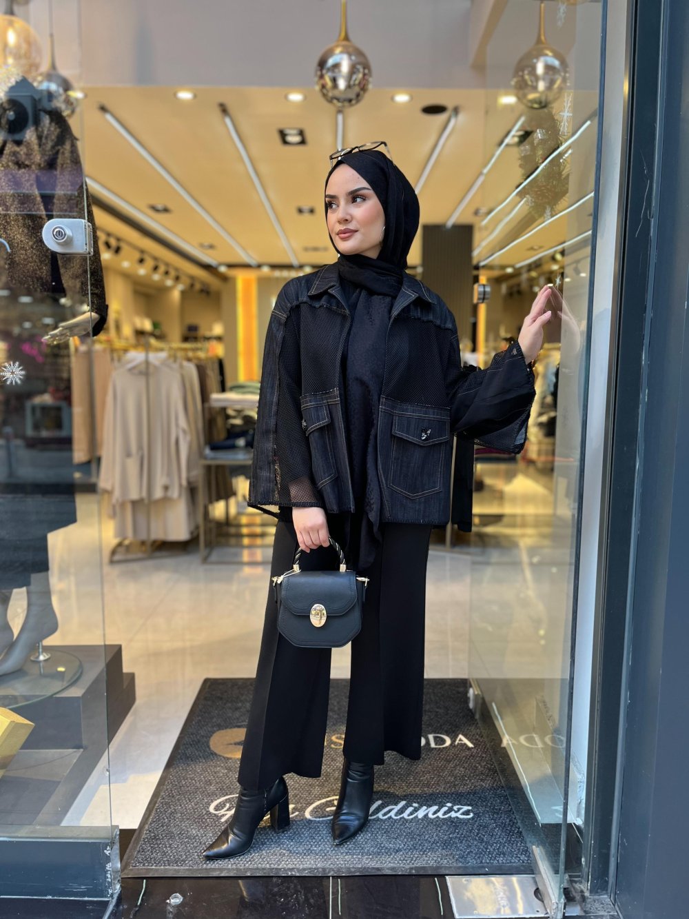Ceremony Fileli Kısa Kot Ceket Siyah Siyah