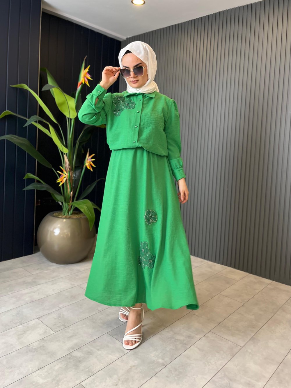 Çiçek Detaylı Keten Etekli Takım Yeşil
