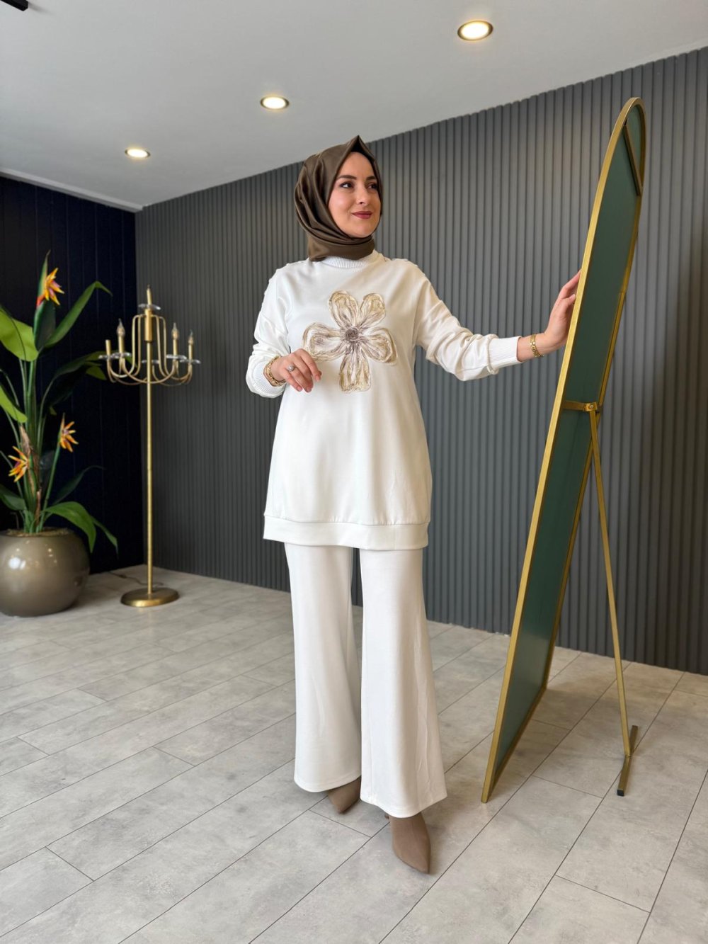 Çiçek İşlemeli Oysho Pantolonlu Takım Ekru