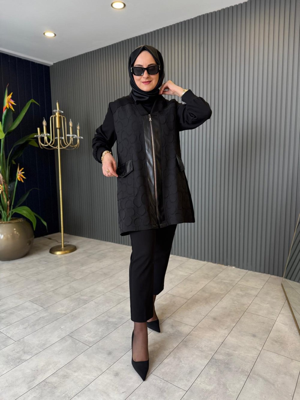 Deri Patlı V Yaka Ceket Siyah