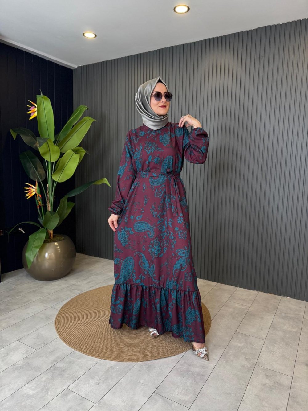 Desenli Kuşak Detaylı Elbise Mürdüm