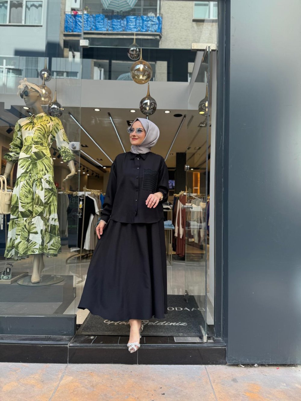 Açıklama: Bu şık iki parçalı takımla zarafeti yakalayın! Akıcı bir etek ve uyumlu bir tunikten oluşan bu set, modern stil ile konforu bir araya getiriyor. Tunik, zarif cep detayı ile dikkat çekerken, 66 cm uzunluğundaki tunik, 92 cm uzunluğundaki etekle mükemmel bir uyum sağlıyor ve her türlü ortamda giyilebilecek mütevazı ve şık bir görünüm sunuyor. Takım, Siyah, Taş, Mavi ve Gri olmak üzere dört farklı renk seçeneği ile sunuluyor; böylece tarzınıza en uygun olanı seçebilirsiniz.