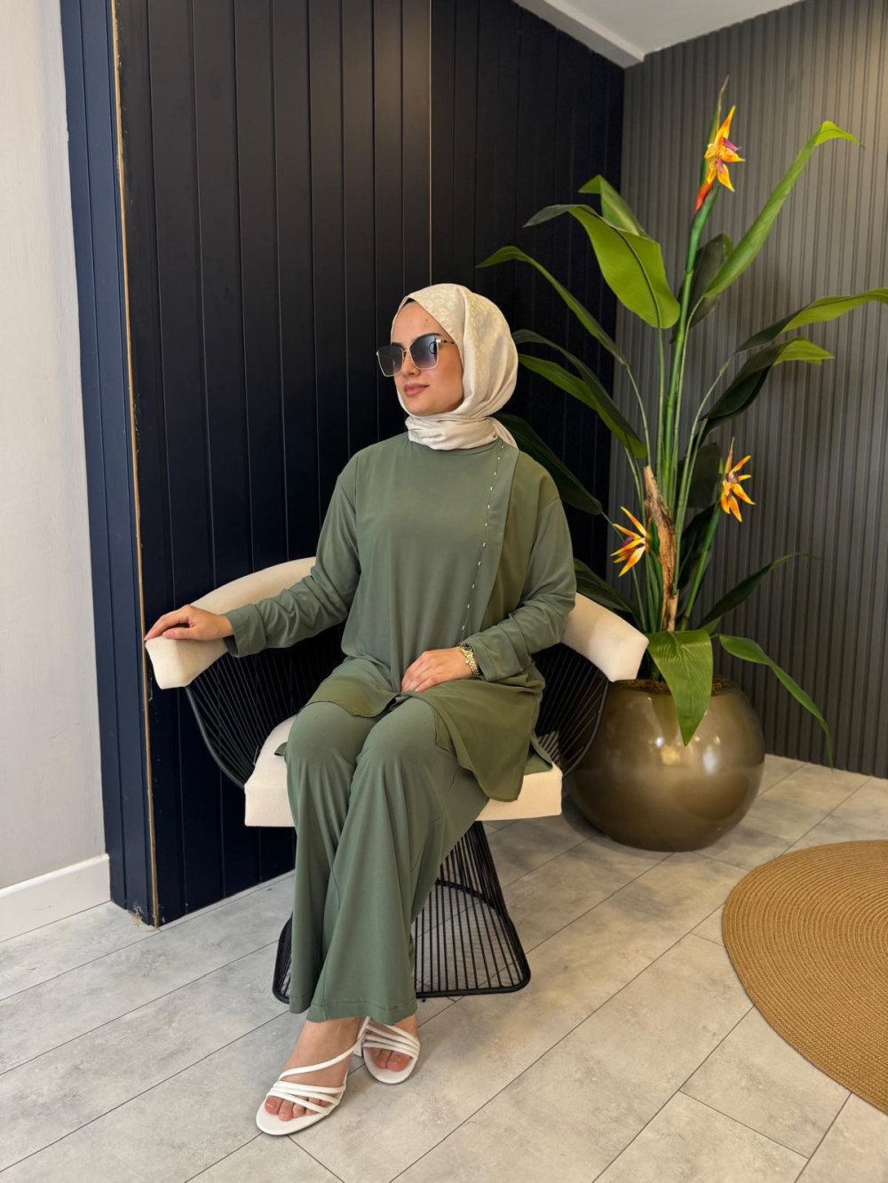 Etek Ucu Şifon Detaylı Bol Paça Sandy Pantolon Takım Haki