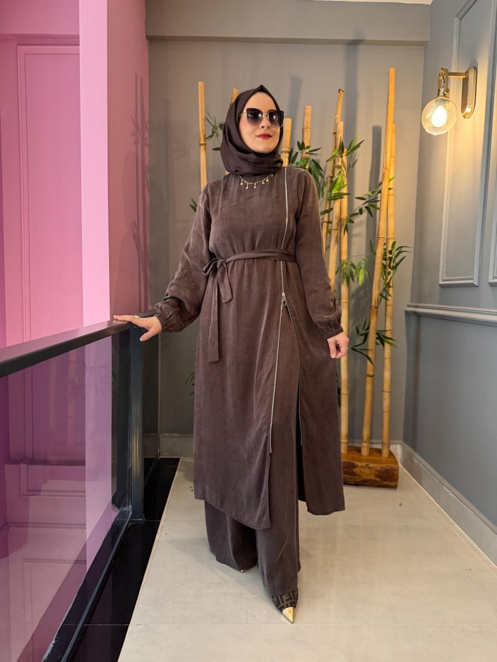 Fermuar Detaylı İpek Kupra Pantolon Takım Kahve