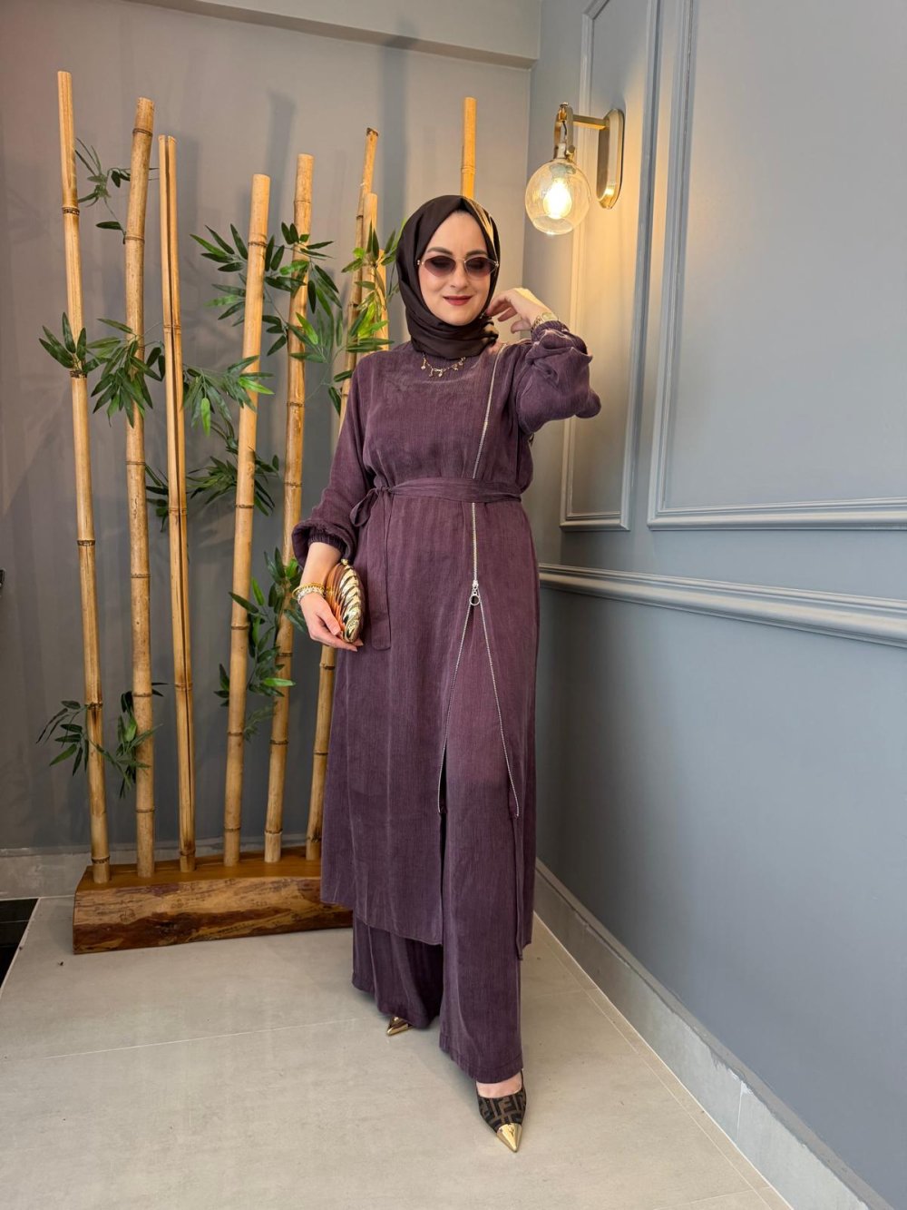 Fermuar Detaylı İpek Kupra Pantolon Takım Mürdüm