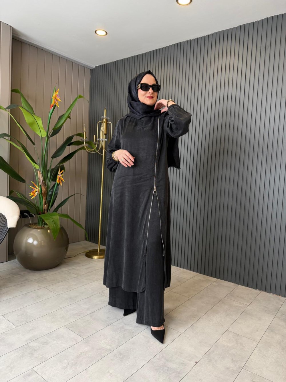 Fermuar Detaylı İpek Kupra Pantolon Takım ??