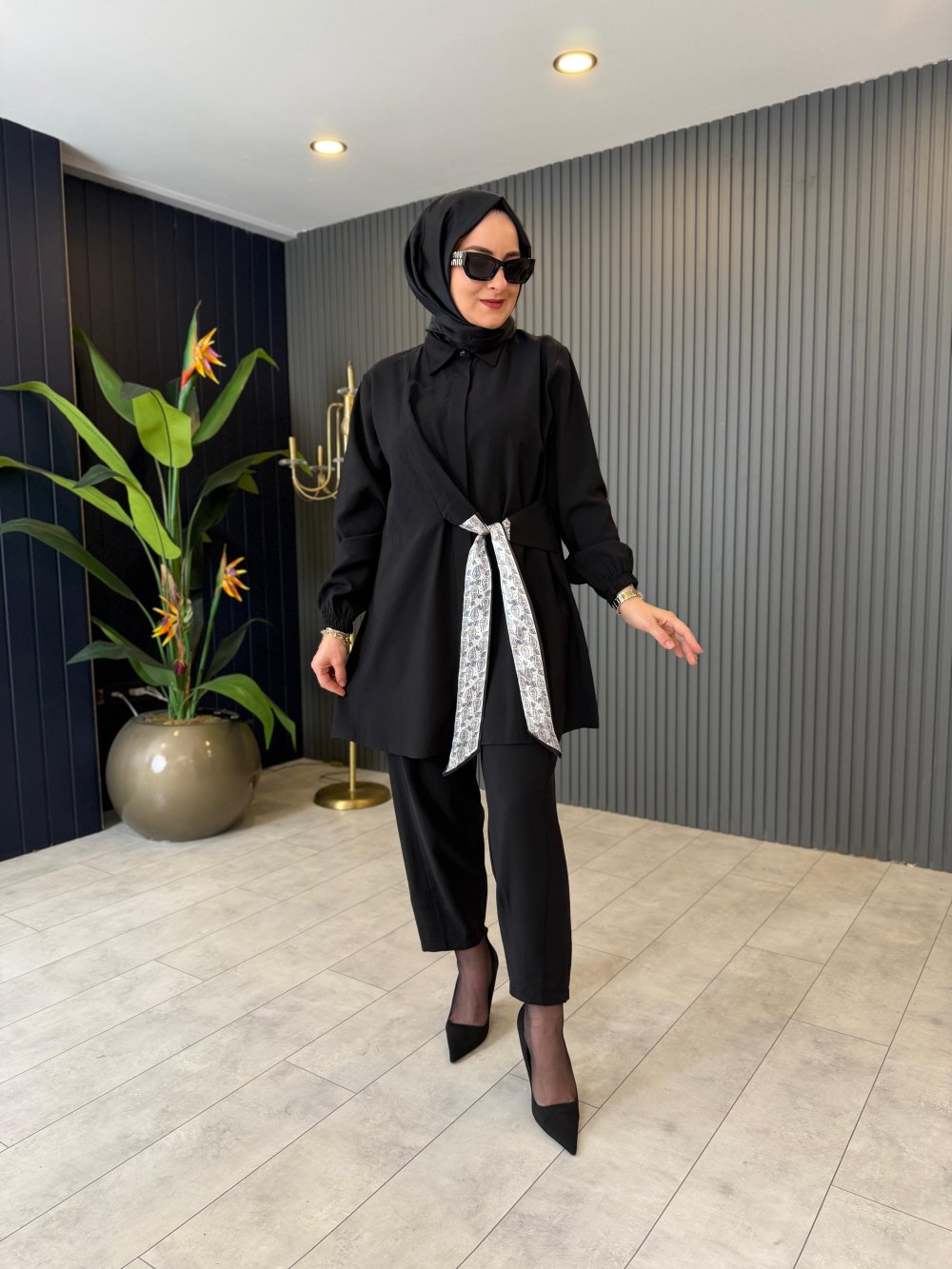 Fular Detaylı Tensel Pantolon Takım Siyah