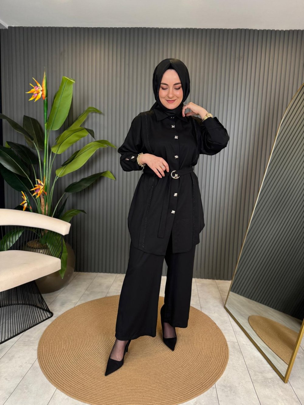 Gömleği Taşlı İthal Lina Takım Siyah