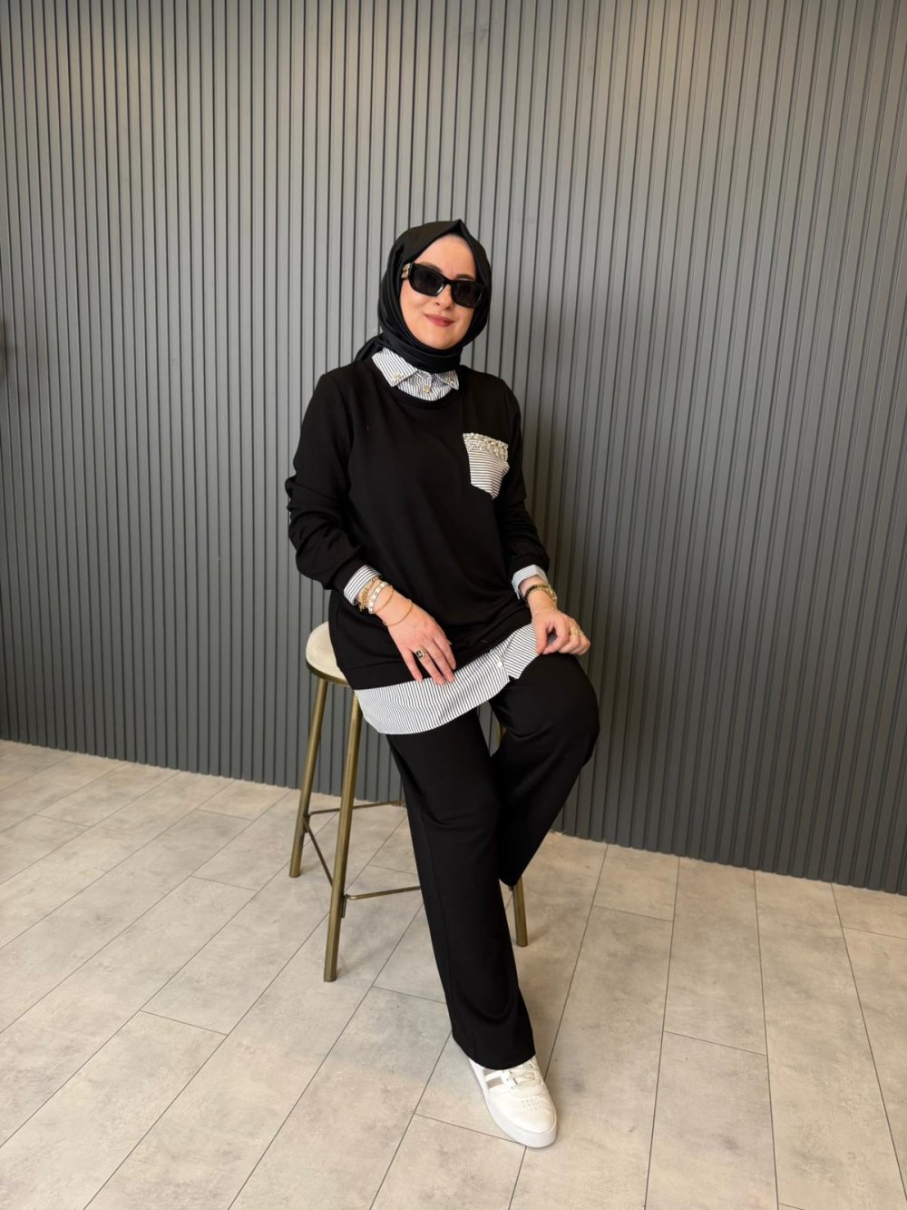 Gömlek Detaylı İkili Pantolonlu Takım Siyah
