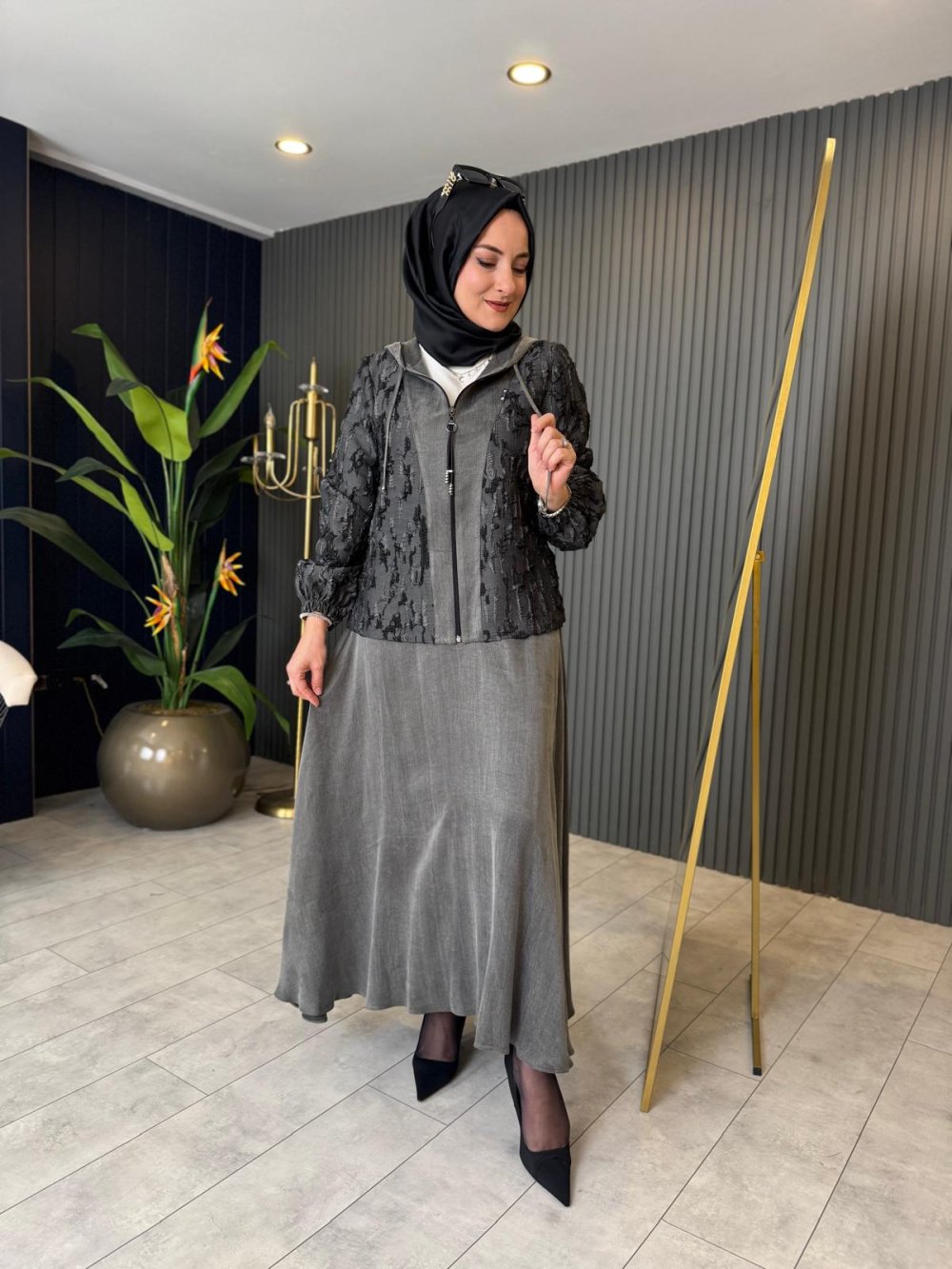 Kapüşonlu Cupra Etekli Takım Gri