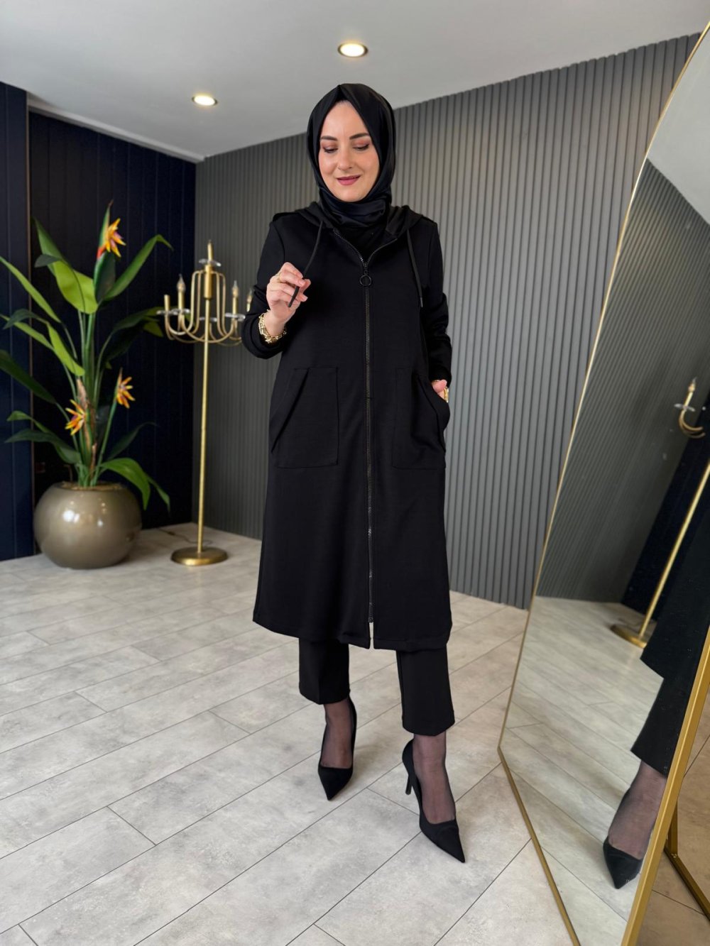 Kapüşonlu Fermuarlı Kap Siyah