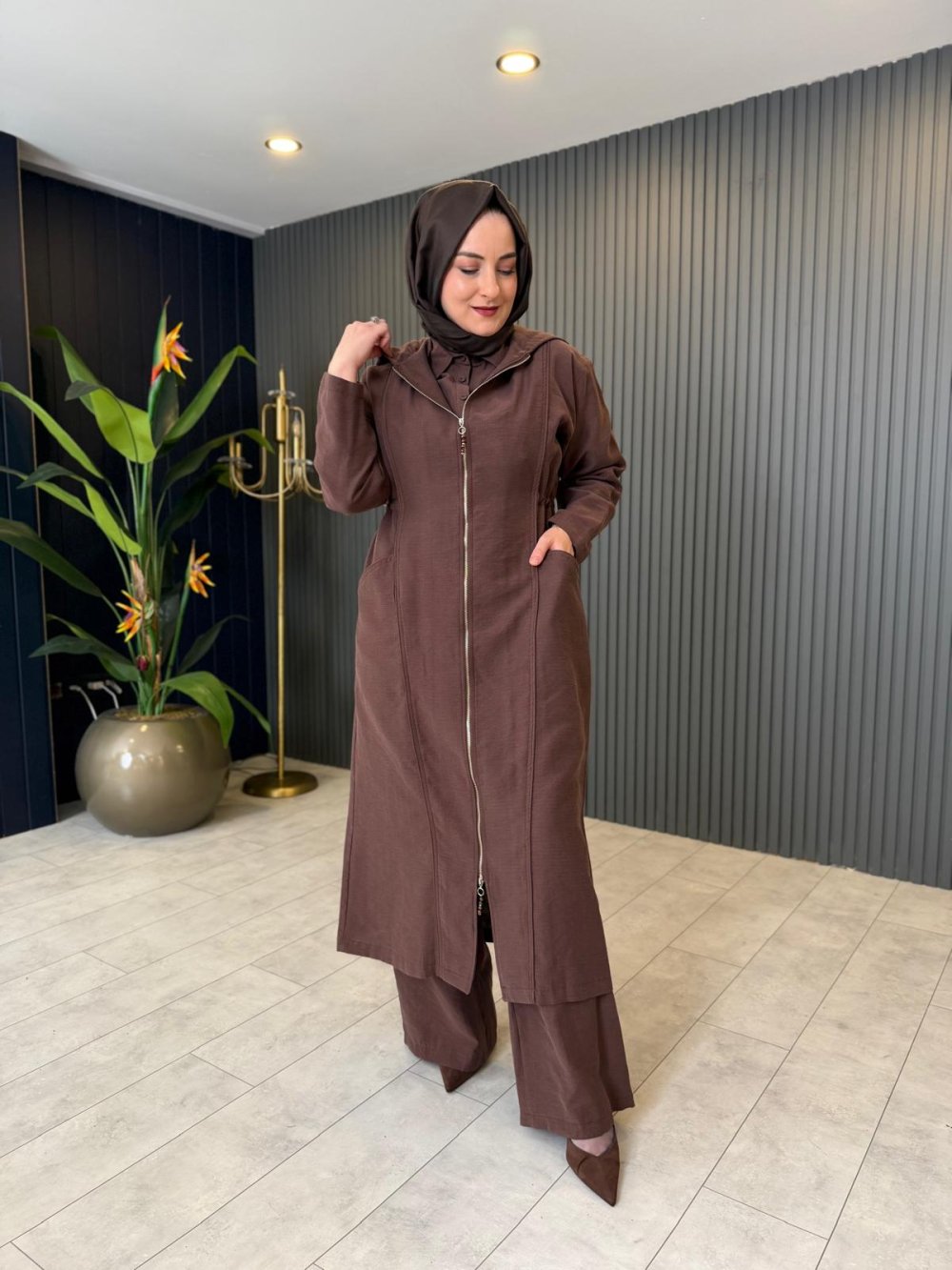 Kapüşonu Ve Önü Fermuarlı Keten Kap Kahverengi