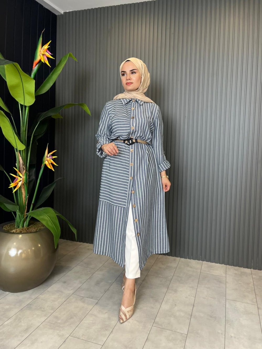 İnce Çizgili Keten Uzun Gömlek?
