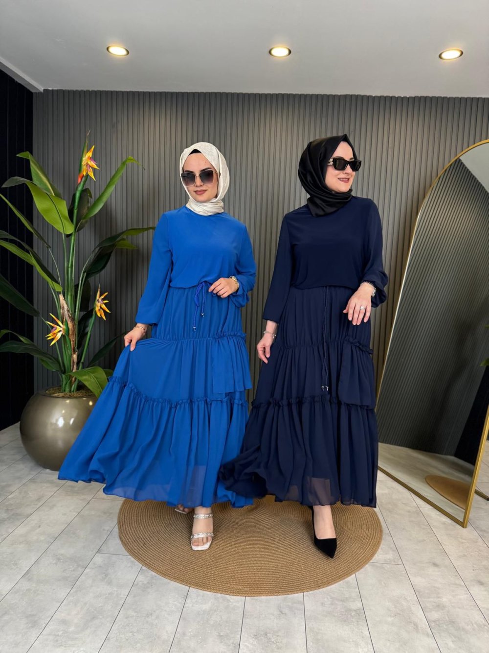 —Bluz Sandy kumaş, Eteği şifon kumaştır. Beli lastikli ve astarlıdır.