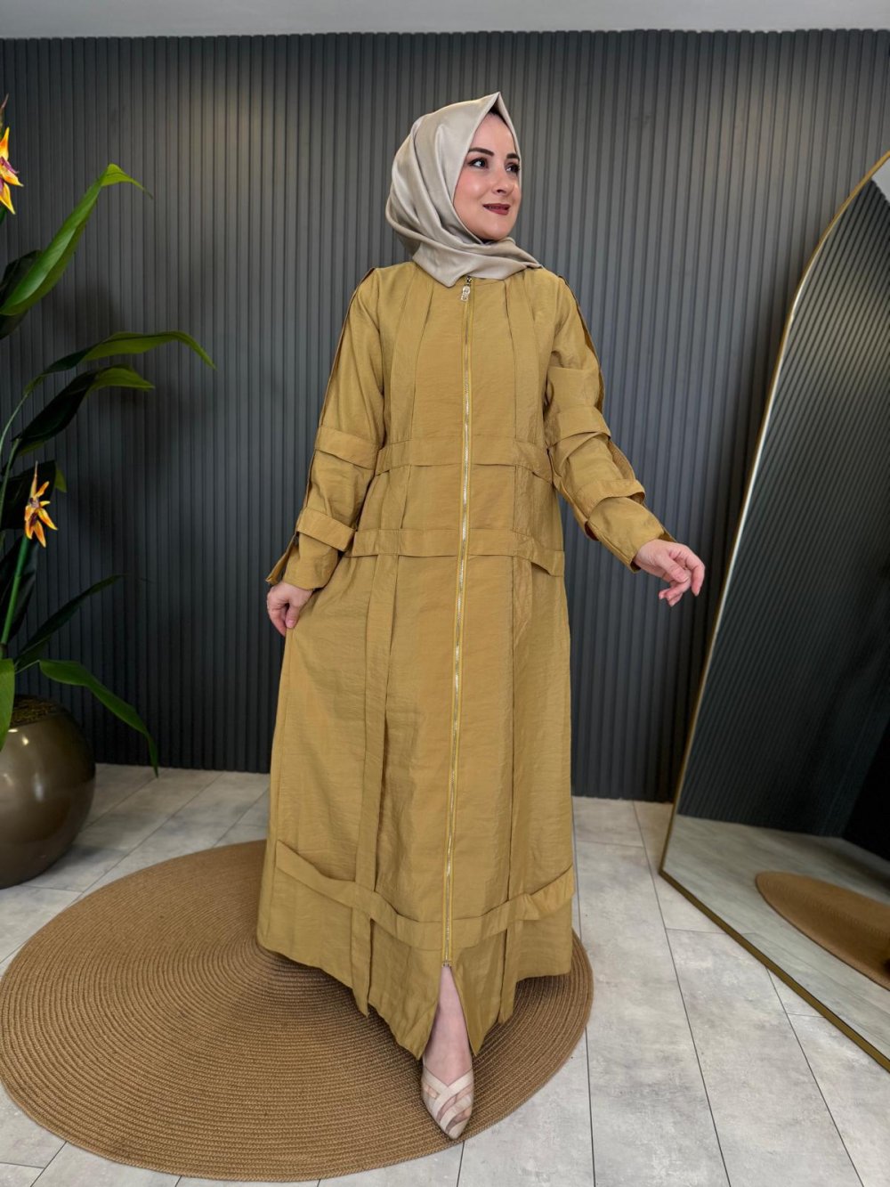 Kolu Ve Ön Bedeni Kafes Detaylı Fermuarlı Ferace Safran