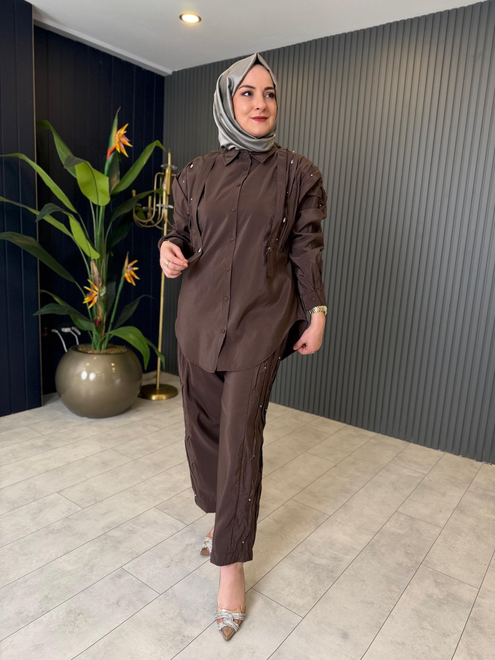 Kraş ve Taş İşlemeli Safari Pantolon Takım Kahverengi