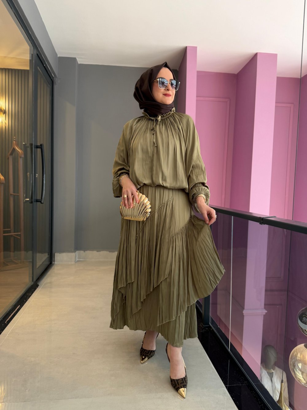 Kraşlı İzabella Etekli Takım Haki