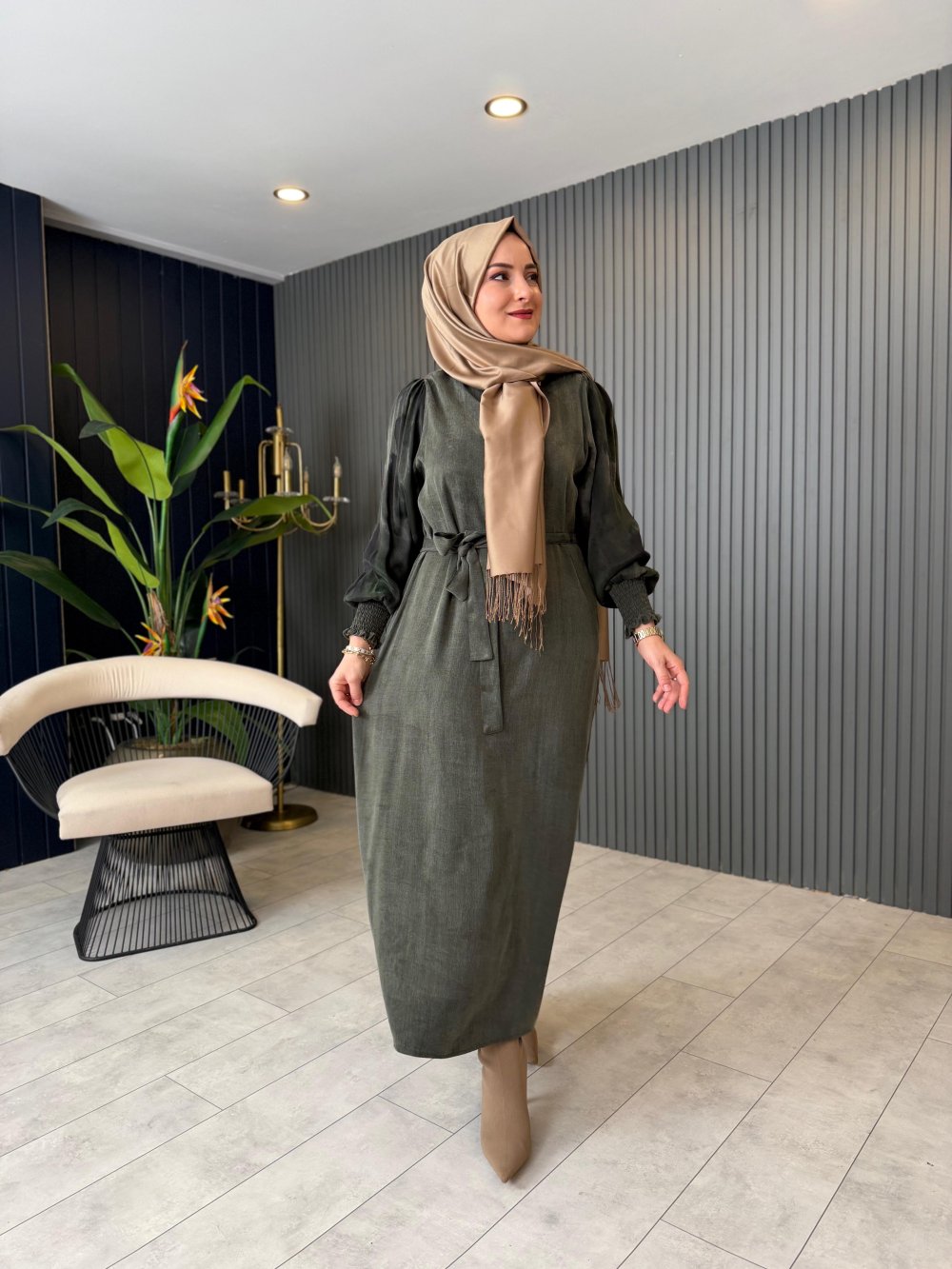 Lamia İpek Kupra Elbise Haki