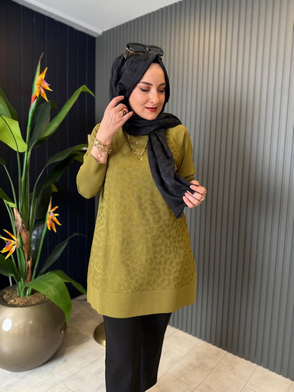 Leopar Desenli Triko Kazak Yağ Yeşili