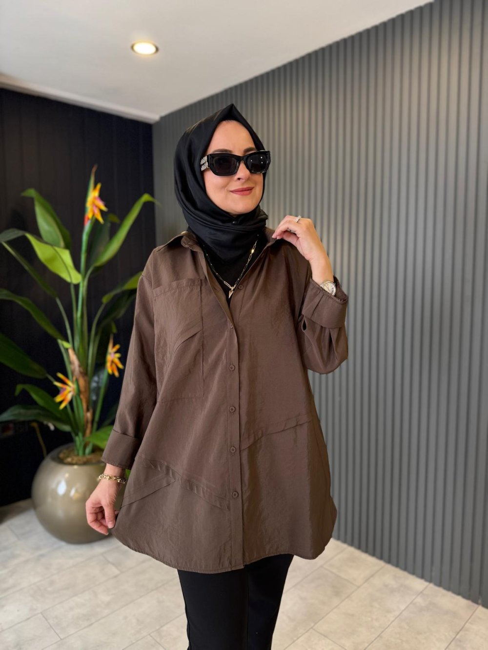 Önden Düğmeli Uzun Cep Detaylı Tunik Kahve