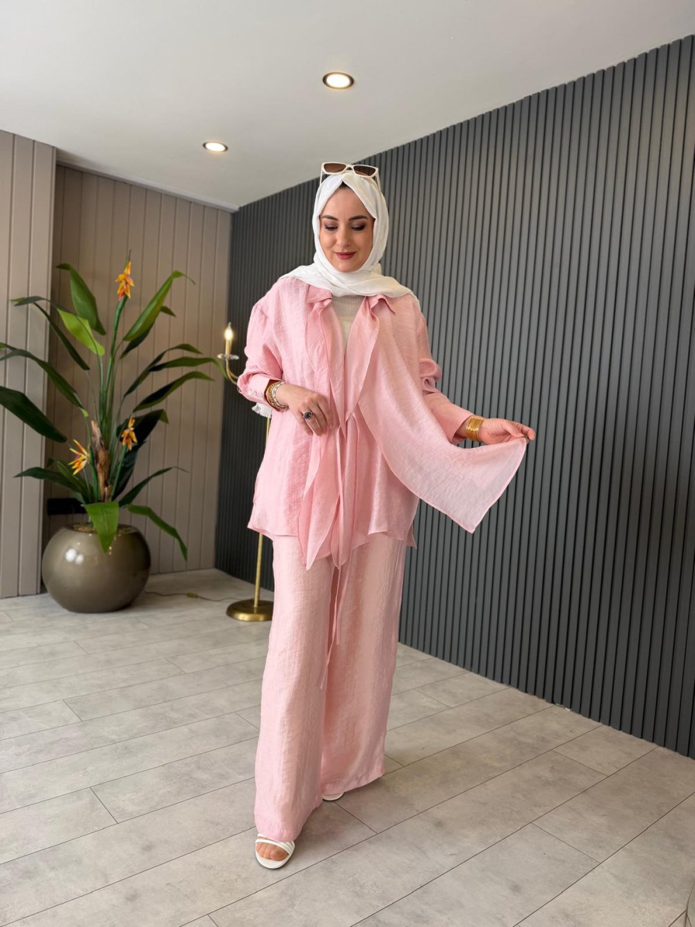 Önden Katkat Bağlama Detaylı Nil Takım Pembe