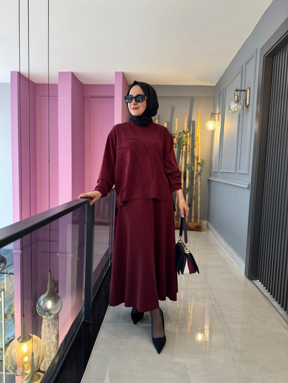 Oval Kesikli Taş İşlemeli Adel Etekli Takım Bordo