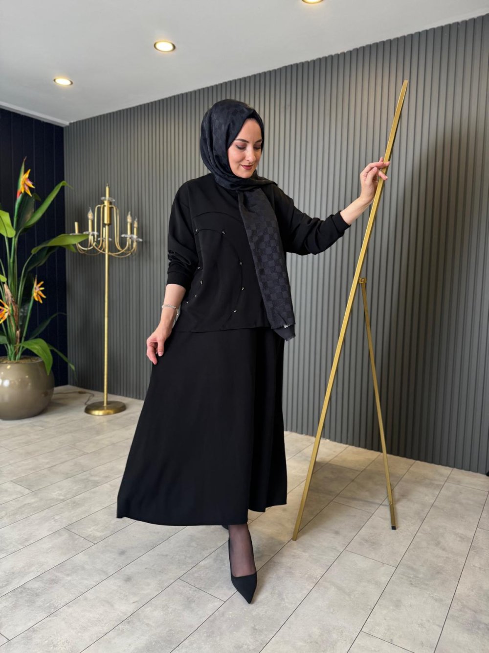 Oval Kesikli Taş İşlemeli Adel Etekli Takım Siyah