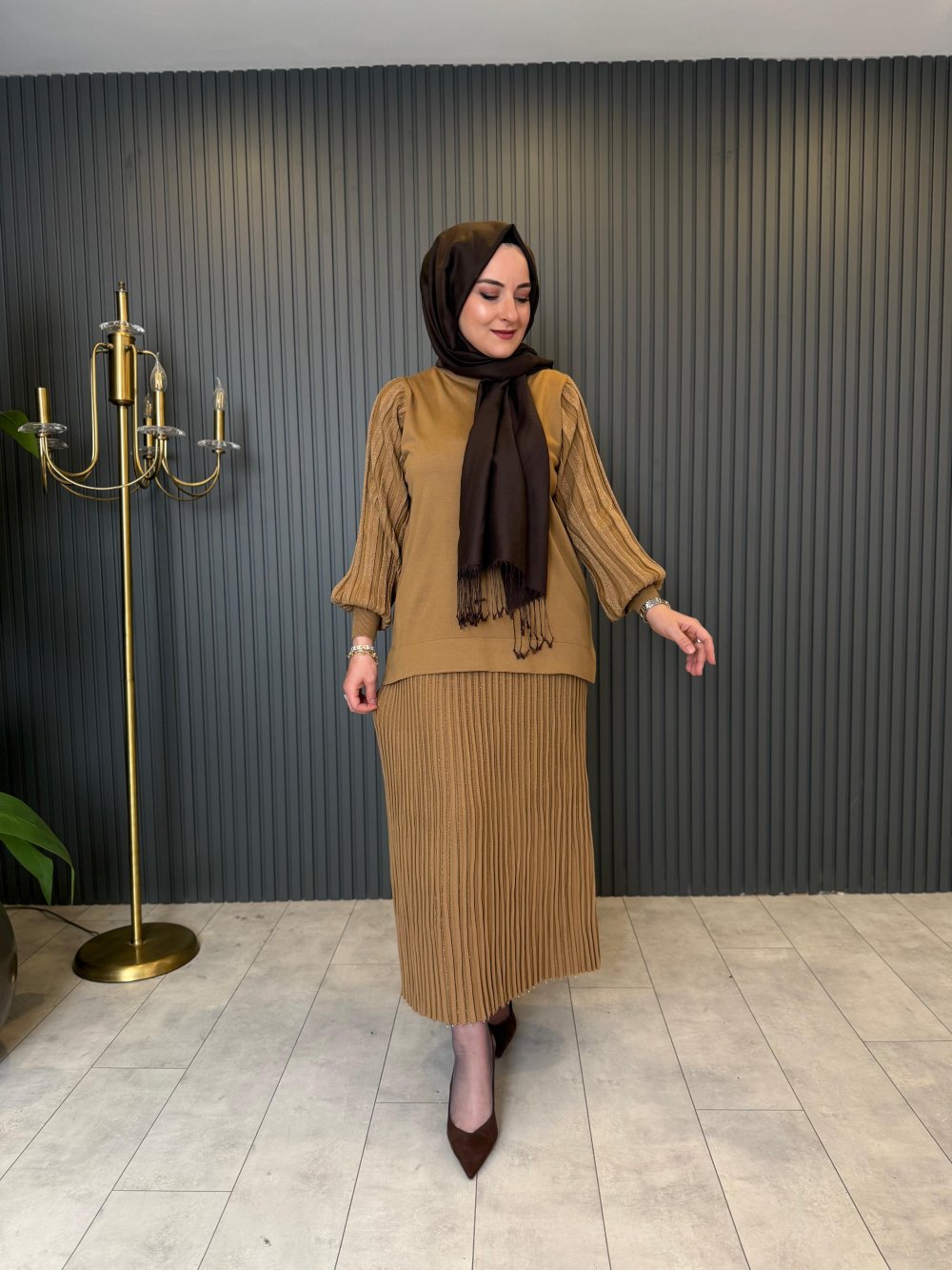 Simli Ribana Detaylı Etekli Takım Camel