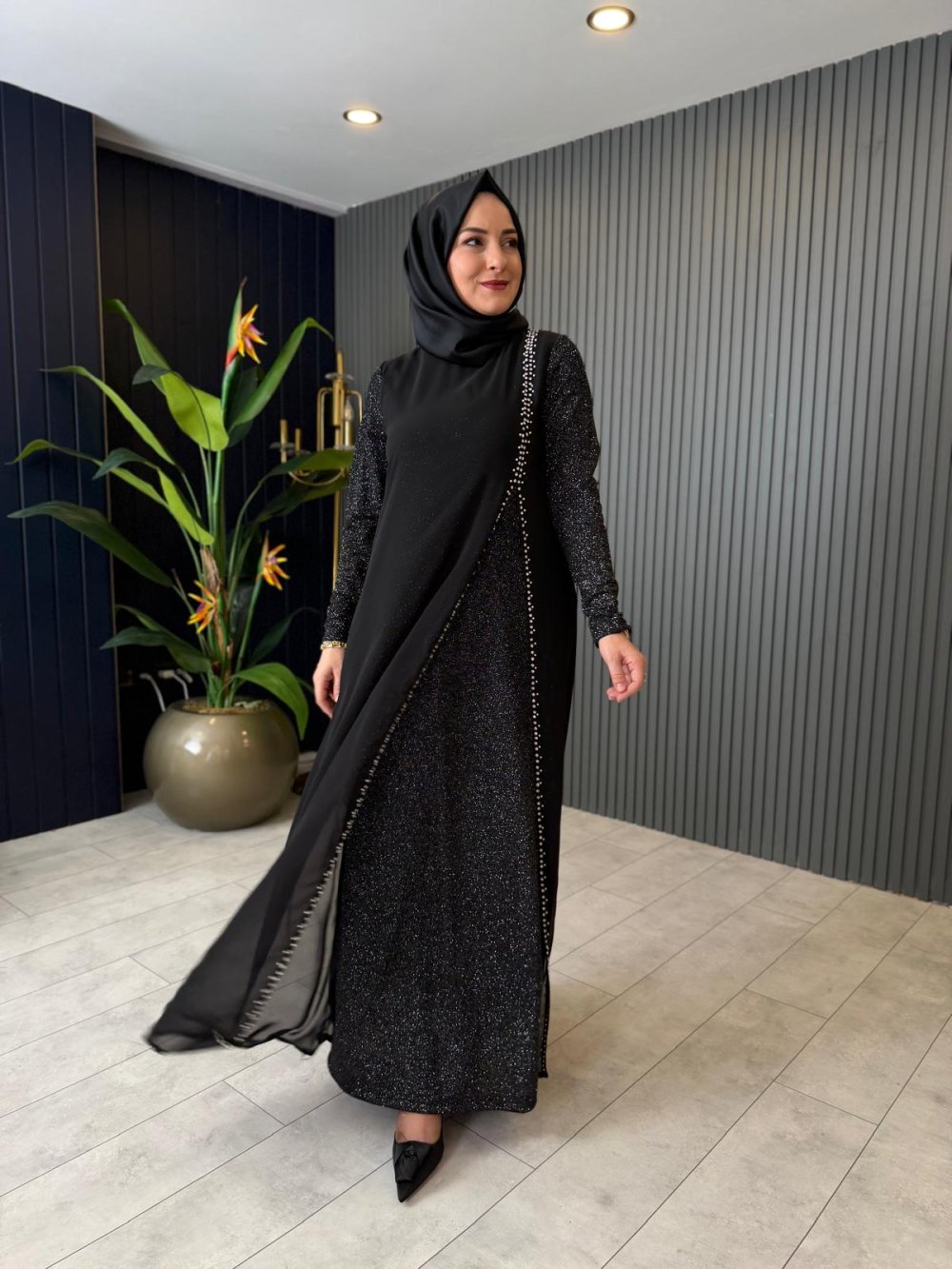 Simli Taş Detaylı Elbise Siyah