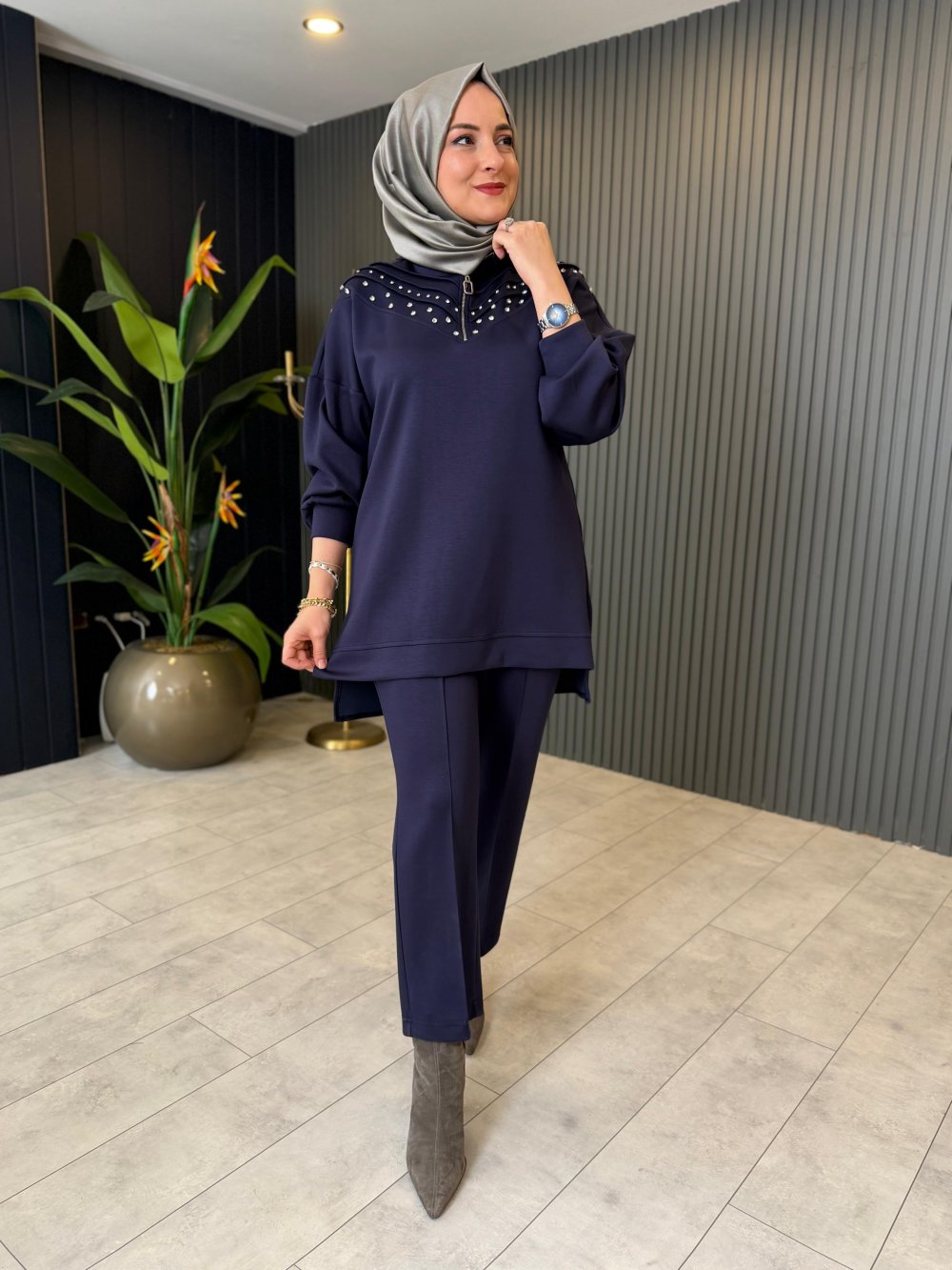 Taş Detaylı Fermuarlı Pantolon Takım Lacivert