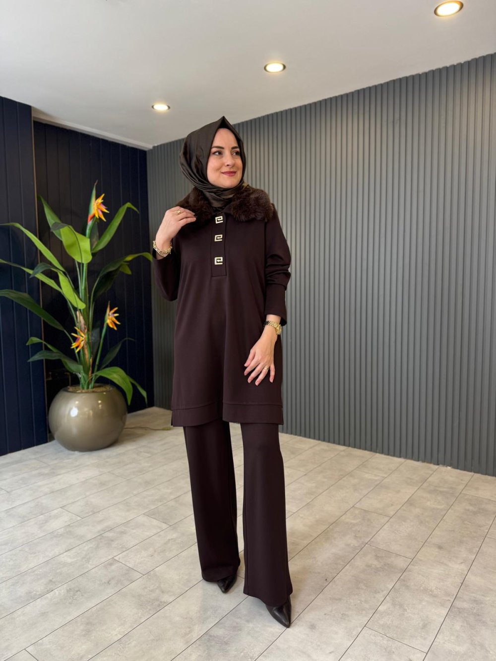 Yaka Kürk Detaylı Pantolonlu Takım Kahverengi