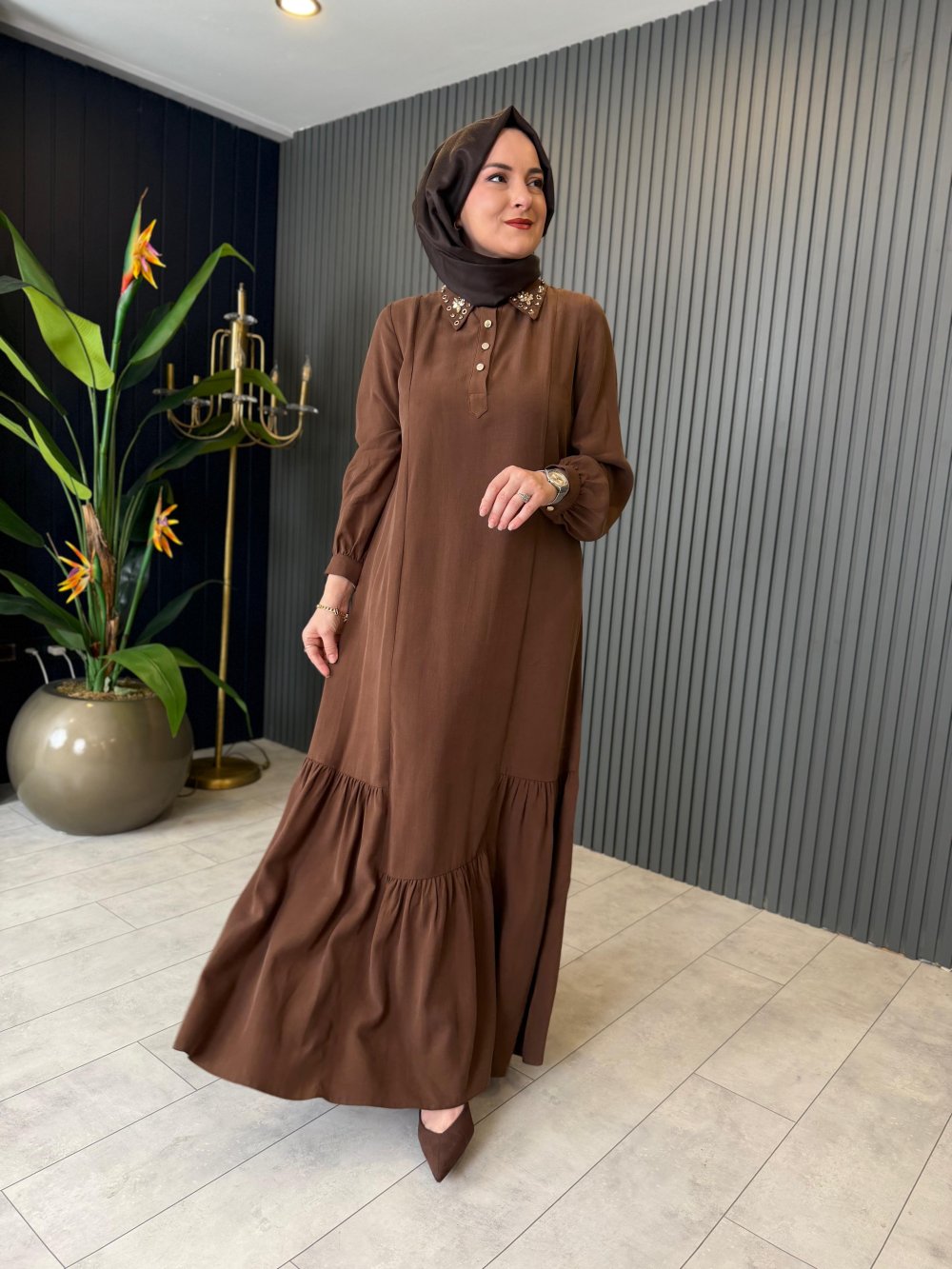 Yaka Taş Detaylı Elbise Kahverengi