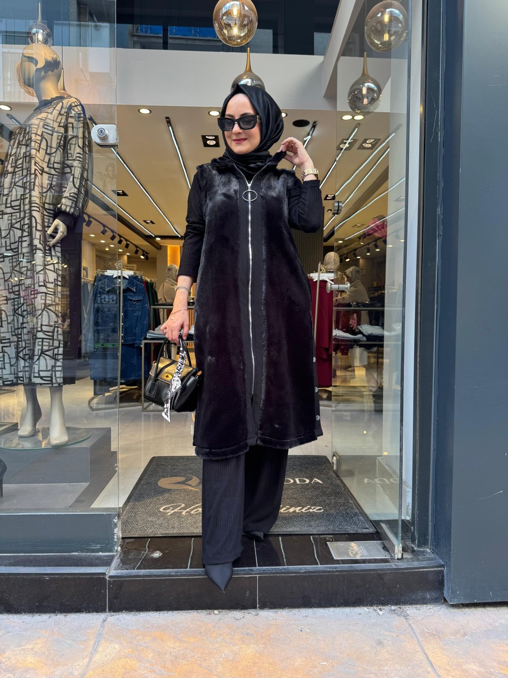 Yırtmaç Çıtçıtlı Pelüş Yelek Siyah